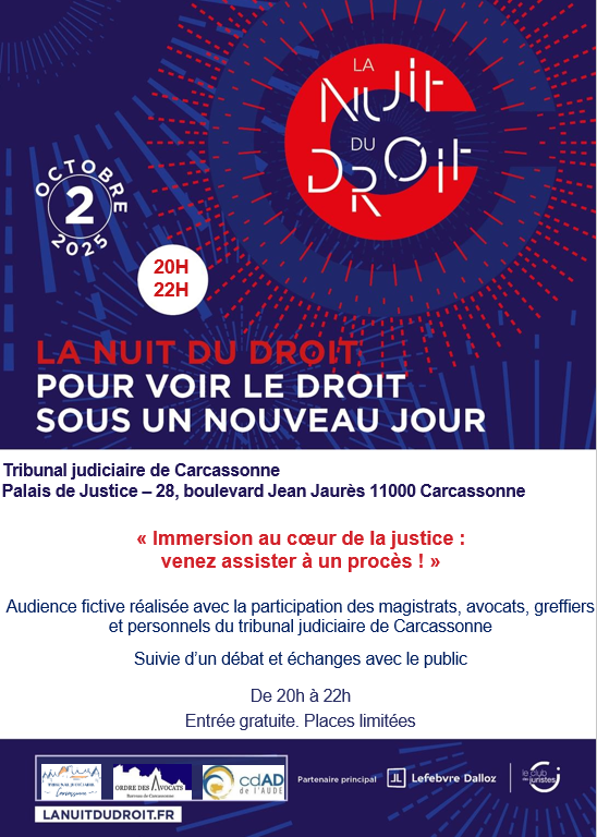 Jeudi 2 octobre 2025, afin de célébrer l’anniversaire de la proclamation de notre Consitution le 4 octobre 1958, le tribunal judiciaire de Carcassonne, le barreau de Carcassonne et le CDAD de l’Aude vous accueillent dans la salle de la cour d’assises de l’Aude pour assister à la reconstitution d’un procès sur des violences conjugales.